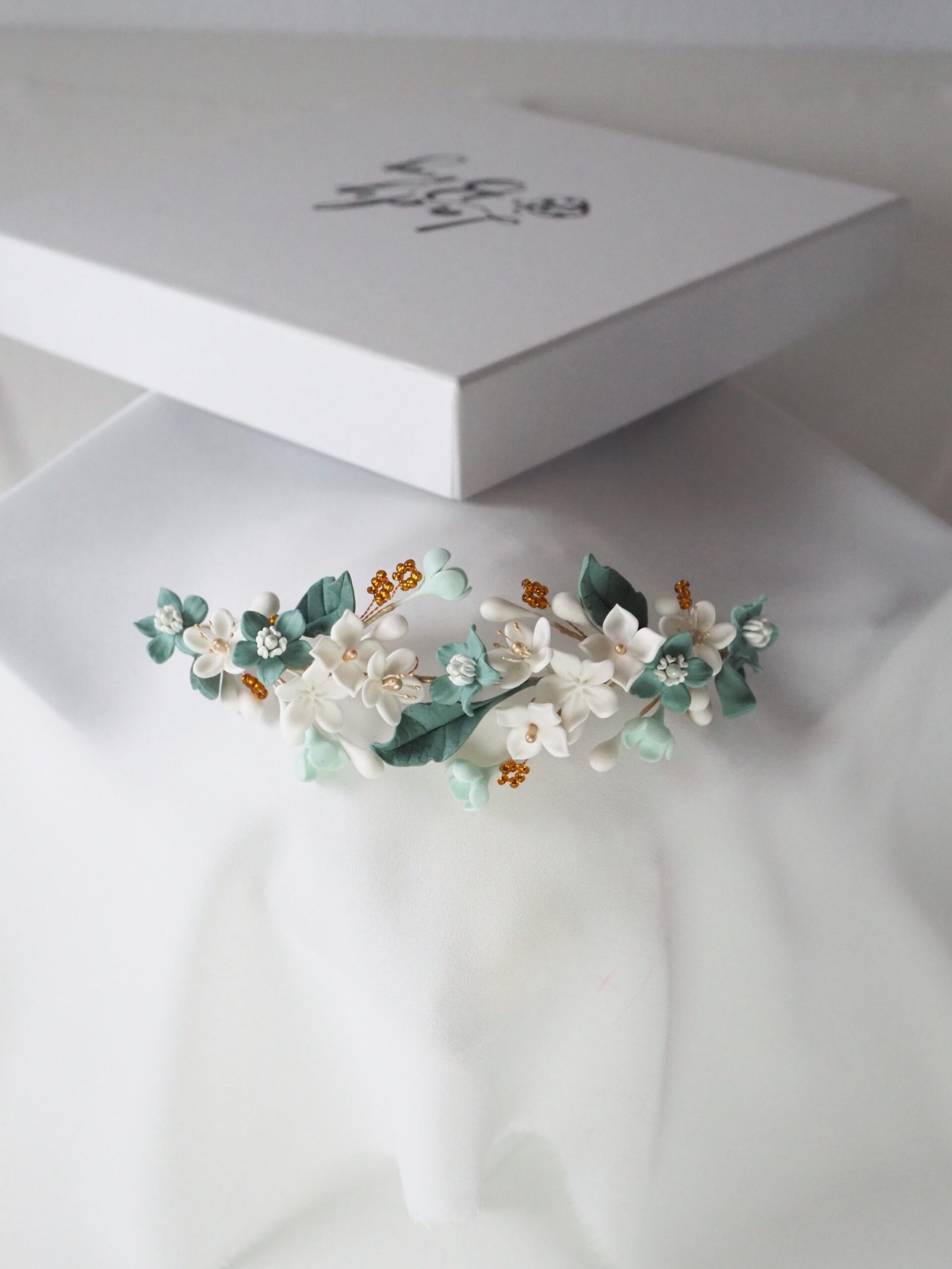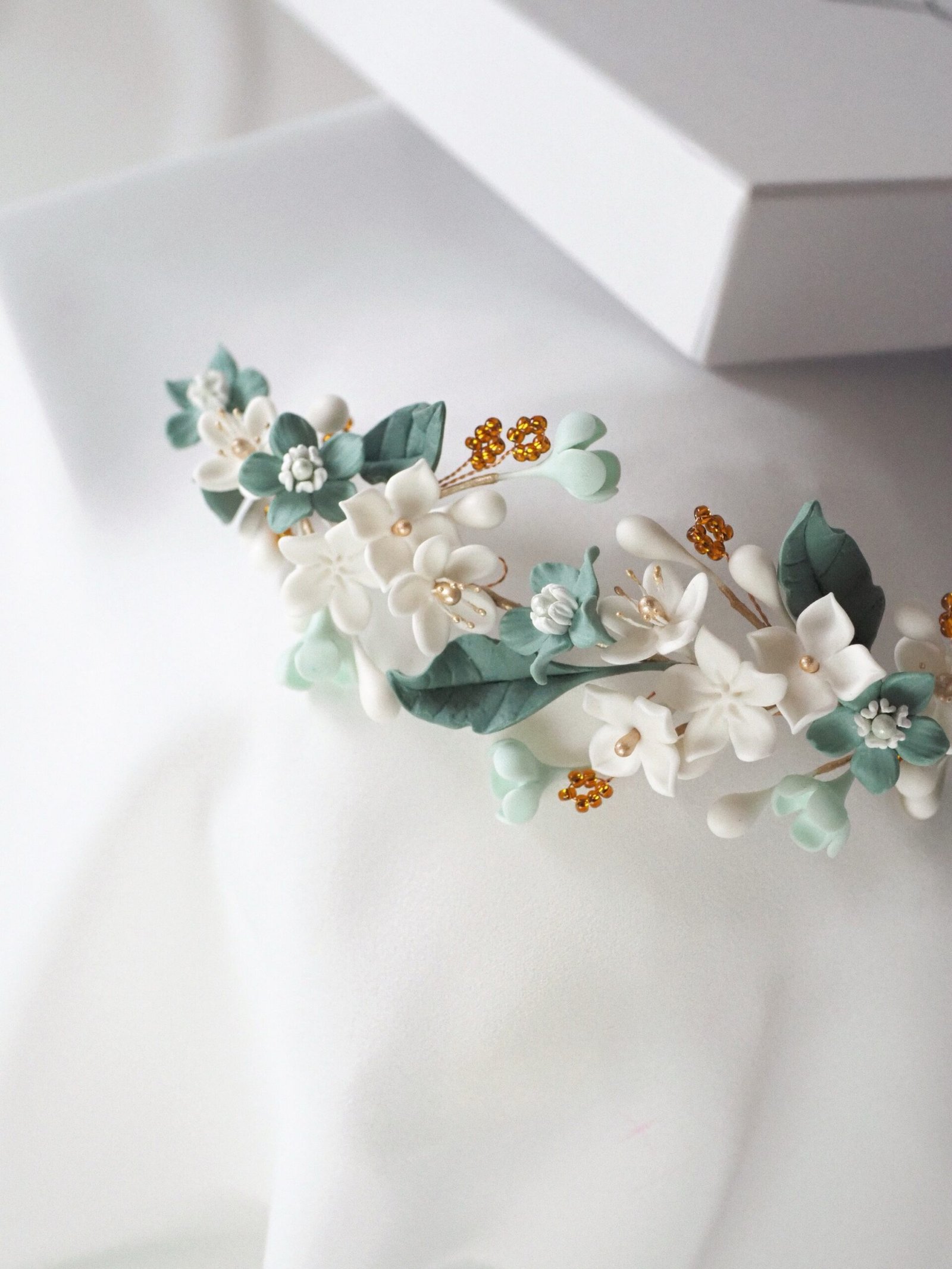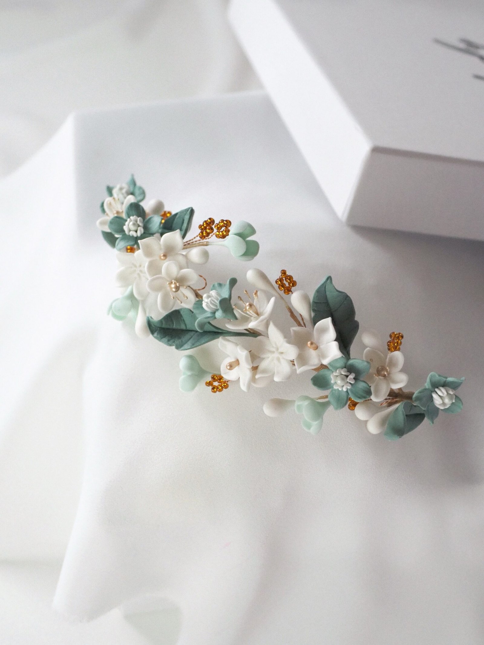 Tocado de novia con flores en tonos verdes y blancos. Detalles dorados y abalorios color ámbar aportan contraste y personalidad, ideal para novias que buscan un complemento diferente y elegante. Con una medida aproximada de 16 centímetros de flor a flor.