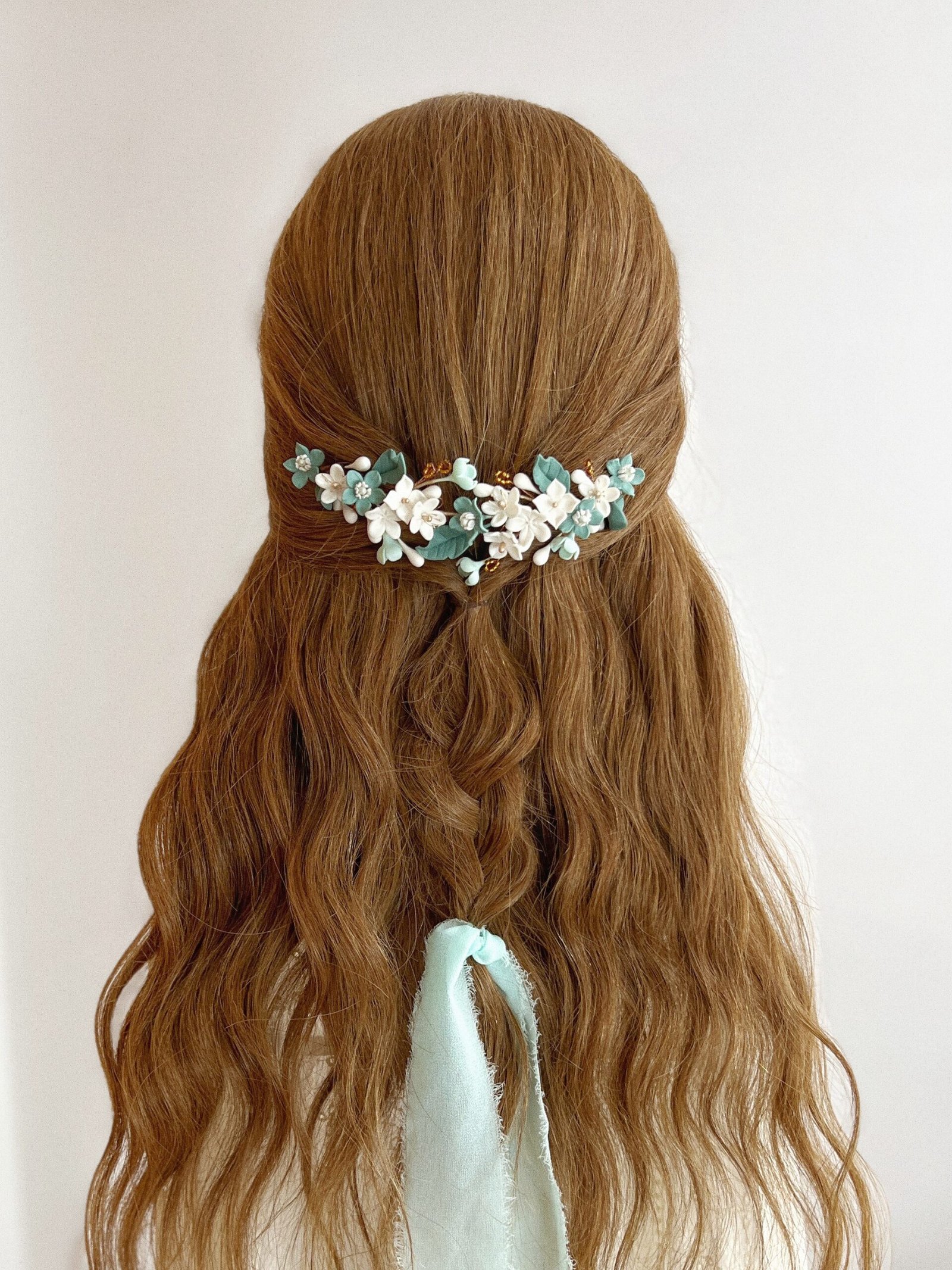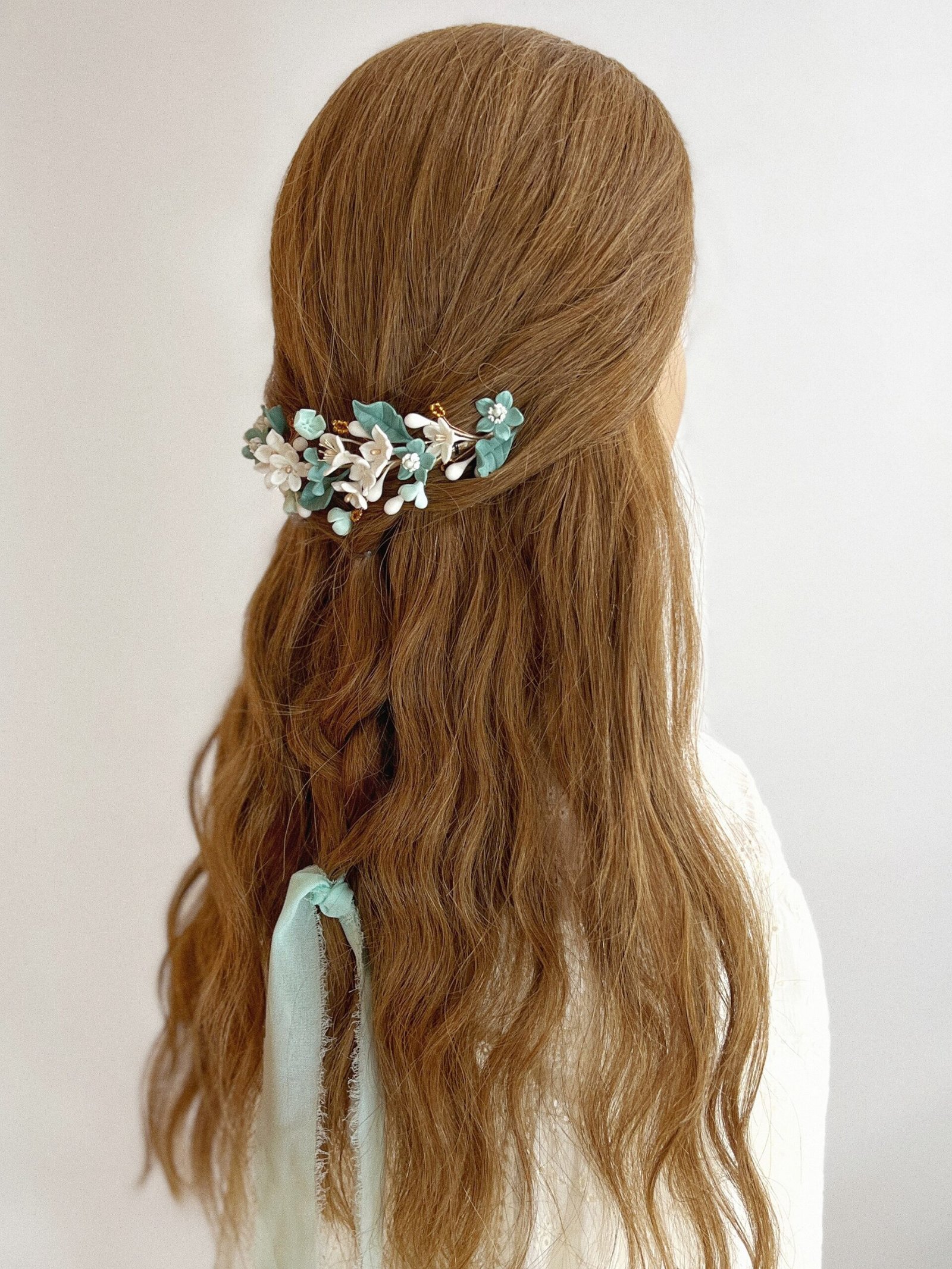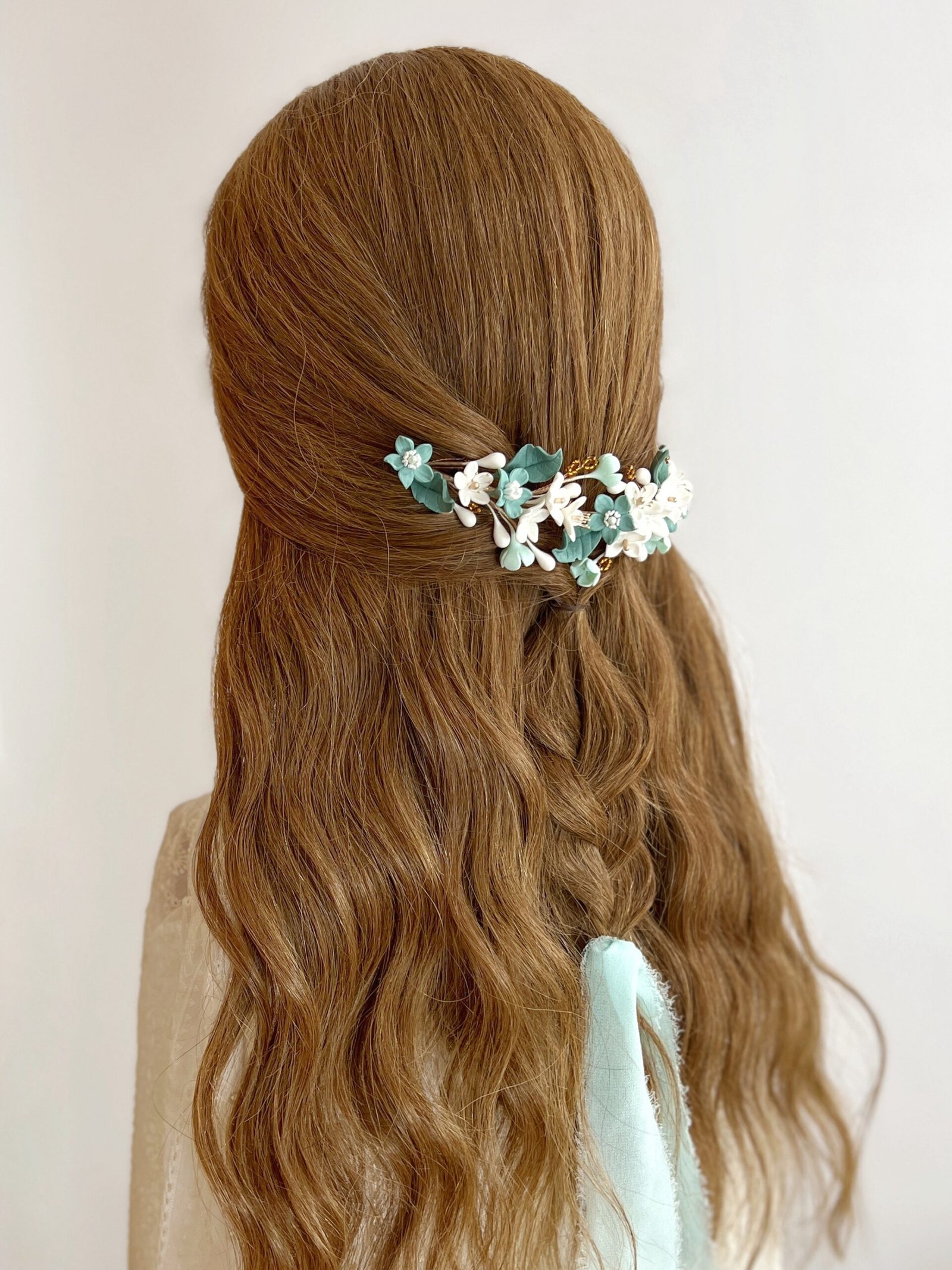 Tocado de novia con flores en tonos verdes y blancos. Detalles dorados y abalorios color ámbar aportan contraste y personalidad, ideal para novias que buscan un complemento diferente y elegante. Con una medida aproximada de 16 centímetros de flor a flor.